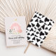 Cute farm animal farm birthday party invitation with cow print back and pink barn.