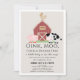 This cute and modern "oink, moo, cock-a-doodle do" gender-neutral baby shower invitation features a pig, chicken, and cow with a red barn on a beige background framed by a white border. The reverse side features a white background with black cow patterns. Personalise for your needs. You can find matching products at my store.