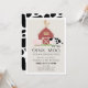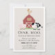 This cute and modern "oink, moo, cock-a-doodle do" gender neutral birthday party invitation features a pig, chicken, and cow with a red barn on a light beige background framed by a white border. The reverse side features a white background with black cow patterns. Personalise for your needs. You can find matching products at my store.