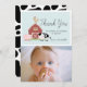 This cute and modern boy's birthday thank you photo card features a pig, chicken, and cow with a red barn on a light blue background framed by a white border. The reverse side features a white background with black cow patterns. Personalise for your needs. You can find matching products at my store.