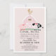 This cute and modern "oink, moo, cock-a-doodle do" drive-by girl baby shower by mail invitation features a pig, chicken, and cow with a pink barn on a blush pink background framed by a white border. The reverse side features a white background with black cow patterns. Personalise for your needs. You can find more matching products at my store.