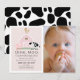 This cute and modern "oink, moo, cock-a-doodle do" girl's 1st/first birthday photo invitation features a pig, chicken, and cow with a pink barn on a blush pink background framed by a white border. The reverse side features a white background with black cow patterns. Personalise for your needs. You can find matching products at my store.