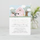 This cute and modern "oink, moo, cock-a-doodle do" virtual/zoom/facebook/online baby shower invitation for a baby girl features a pig, chicken, and cow with a pink barn with trees and blue sky. The reverse side features a white background with light grey gingham/buffalo plaid/checks. Personalise for your needs. You can find matching products at my store.