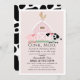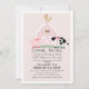 This cute and modern "oink, moo, cock-a-doodle do" virtual/online girl baby shower by mail invitation features a pig, chicken, and cow with a pink barn on a blush pink background framed by a white border. The reverse side features a white background with black cow patterns. Personalise for your needs. You can find more matching products at my store.