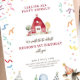 Welcome to this fun and heartwarming Down on the Farm Animals Barnyard first Birthday Invitation! This modern watercolor invitation features a rustic red barn surrounded by wild farm animals including a pig, cow, goose, and sheep. Perfect for a celebration of your little one's first birthday, this invitation captures the lively spirit of the outdoors and feature a unique design that will delight all your guests.