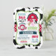 Farm theme birthday invite with cow, sheep, goat, and pig over cowhide print, red gingham check print country boy design over chalkboard background.