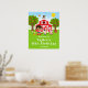 This cute and fun welcome sign features a brown hair girl with dark skin beside a red barn with a rooster wind vane. There are adorable farm animals such as a cow, pig and hen. In the background is a bright blue sky, apple trees, sunshine, butterflies and daisies. The text combines bold and sans serif fonts for a stylish and modern look. This is perfect for a farm themed birthday party.