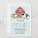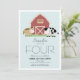 This cute and modern gender neutral or boy's birthday party invitation features a horse and cow with a red barn on a light blue background framed by a white border. The reverse side features a white background with black cow patterns. Personalise for your needs. You can find matching products at my store.