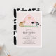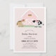 This cute and modern girl's baby shower invitation features a horse and cow with a pink barn on a blush pink background framed by a white border. The reverse side features a white background with black cow patterns. Personalise for your needs. You can find matching products at my store.