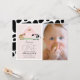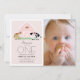 This cute and modern girl's 1st / first birthday photo invitation features a horse and cow with a pink barn on a blush pink background framed by a white border. The reverse side features a white background with black cow patterns. Personalise for your needs. You can find matching products at my store.