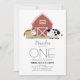 This cute and modern gender neutral 1st / first birthday party invitation features a horse and cow with a red barn on a white background. The reverse side features a white background with black cow patterns. Personalise for your needs. You can find matching products at my store.