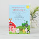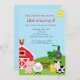 Cute farm theme invitation with blue polka dot background, with barnyard, cow, duck, pig, sheep, rooster, and green tractor.