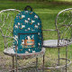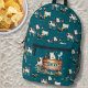 Kids backpack with cows, goats and chickens design. Personalise this pretty teal blue pack with child's name. Farm themed pattern is perfect for boys or girls and features a fun collection of barnyard friends. More animals line up across the zipper and side sections. The name template is over a rustic wooden sign on the zippered pocket.