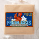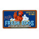 Absolutely adorable and eye-catching FARM FRESH EGGS carton label featuring a cute chicken character sitting in a box full of eggs. She is waving HELLO. Text is customisable so that you can change it according to your specific need.