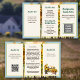 Rural homestead small business brochure to customise on both sides and fold into thirds. The background is sunflowers and a picket fence. Text is green for the headings and dark brown for the rest. Each side of this 5x8 size paper has three sections with text templates. Also add a logo, QR code, and / or photo in the spaces provided. If you don’t want to use one or more of the image holders, remove it by going to the “edit in design tool” which can be found by scrolling to the bottom of the personalise area. In the design area choose the image by clicking on it, then hit the “trash can” symbol for that image. Changing the size of the paper may alter the design to not fit correctly. Contact me if you’d like some help.