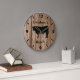 Personalize this custom barnwood styled clock with your farm, ranch, or stable name to add a personal touch to the decor. Perfect for the rodeo or livestock barn. Brown barnwood look clock face with beef bull cow silhouette in center. Choose one of two sizes and two colors of clock hand, whichever is to your liking.