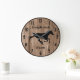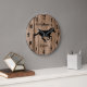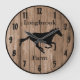 Personalize this custom barnwood styled clock with your farm, ranch, or stable name to add a personal touch to the decor. Brown barnwood look clock face with galloping horse silhouette in center. Choose one of two sizes and two colors of clock hand, whichever is to your liking.