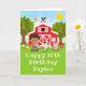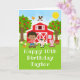 This cute and fun birthday card can be personalised with a name or title such as son, grandson, nephew, friend etc. It features a brown hair boy with dark skin beside a red barn with a rooster wind vane. There are adorable farm animals such as a cow, pig and hen. In the background is a bright blue sky, apple trees, sunshine, butterflies and daisies. The text combines bold and sans serif fonts for a stylish and modern look. This is perfect for a farm themed birthday party.
