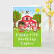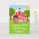 This cute and fun birthday card can be personalised with a name or title such as daughter, granddaughter, niece, friend etc. It features a brown hair girl with dark skin beside a red barn with a rooster wind vane. There are adorable farm animals such as a cow, pig and hen. In the background is a bright blue sky, apple trees, sunshine, butterflies and daisies. The text combines bold and sans serif fonts for a stylish and modern look. This is perfect for a farm themed birthday party.