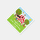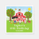 This cute and fun napkin features a black hair girl with fair skin beside a red barn with a rooster wind vane. There are adorable farm animals such as a cow, pig and hen. In the background is a bright blue sky, apple trees, sunshine, butterflies and daisies. The text combines bold and sans serif fonts for a stylish and modern look. This is perfect for a farm themed birthday party.