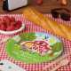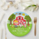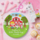 This cute and fun plate features a blonde hair boy with fair skin beside a red barn with a rooster wind vane. There are adorable farm animals such as a cow, pig and hen. In the background is a bright blue sky, apple trees, sunshine, butterflies and daisies. The text combines bold and sans serif fonts for a stylish and modern look. This is perfect for a farm themed birthday party.