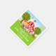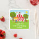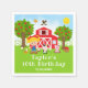 This cute and fun napkin features a blonde hair girl with fair skin beside a red barn with a rooster wind vane. There are adorable farm animals such as a cow, pig and hen. In the background is a bright blue sky, apple trees, sunshine, butterflies and daisies. The text combines bold and sans serif fonts for a stylish and modern look. This is perfect for a farm themed birthday party.