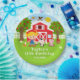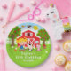 This cute and fun plate features a blonde hair girl with fair skin beside a red barn with a rooster wind vane. There are adorable farm animals such as a cow, pig and hen. In the background is a bright blue sky, apple trees, sunshine, butterflies and daisies. The text combines bold and sans serif fonts for a stylish and modern look. This is perfect for a farm themed birthday party.