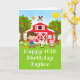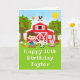 This cute and fun birthday card can be personalised with a name or title such as son, grandson, nephew, friend etc. It features a brown hair boy with fair skin beside a red barn with a rooster wind vane. There are adorable farm animals such as a cow, pig and hen. In the background is a bright blue sky, apple trees, sunshine, butterflies and daisies. The text combines bold and sans serif fonts for a stylish and modern look. This is perfect for a farm themed birthday party.