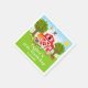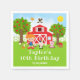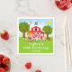 This cute and fun napkin features a red hair girl with fair skin beside a red barn with a rooster wind vane. There are adorable farm animals such as a cow, pig and hen. In the background is a bright blue sky, apple trees, sunshine, butterflies and daisies. The text combines bold and sans serif fonts for a stylish and modern look. This is perfect for a farm themed birthday party.