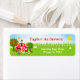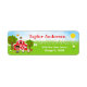 This cute and fun address label features a brown hair boy with dark skin beside a red barn with a rooster wind vane. There are adorable farm animals such as a cow, pig and hen. In the background is a bright blue sky, apple trees, sunshine, butterflies and daisies. The text combines bold and sans serif fonts for a stylish and modern look. This is perfect for a farm themed birthday party.