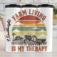 This is a rustic graphic design with a farm theme. The central image features a classic tractor pulling a trailer, and a traditional barn with a windmill. The scene is set in a ploughed field against a sunset background with a radiant sun and clouds. The phrases "FARM LIVING" and "IS MY THERAPY" are prominently displayed above and below the scene in a bold, weathered font. The design is enclosed at the bottom by a fence with decorative wheat bundles.