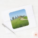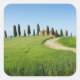 Photo sticker with a curvy road through the grain crops towards a farm villa with a row of cypress trees in front of it near Pienza in Val d'Orcia valley in Tuscany, Italy.