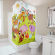Colourful and fun shower curtain features a farm scene with hay barn, apple trees, sun, windmill, and farm animals including a bull, horse, goat, pig, sheep, rooster, chicken, duck, and a dog!
