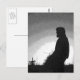 This striking fine art black and white postcard features the sun setting on a farmer in his field. He is holding a bale of hay. An evergreen tree is way back on the horizon. The original photography has been digitally enhanced to create an artistic effect.