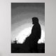 This striking fine art black and white poster features the sun setting on a farmer in his field. He is holding a bale of hay. An evergreen tree is way back on the horizon. The original photography has been digitally enhanced to create an artistic effect.