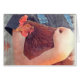 A farm girl (or boy) wearing a black t-shirt and blue jean denim work overalls holds a fluffy red layer hen nestled comfortably in one arm. Painted style effect applied to an original photograph.