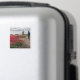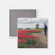 Souvenir photo magnet of a farmer wearing yellow wooden shoes inspecting his red tulips with in the background a traditional windmill in spring in the flower Bulb Region in the Netherlands.