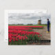 Postcard of a farmer wearing yellow wooden shoes inspecting his red tulips with in the background a traditional windmill in spring in the flower Bulb Region in the Netherlands with a fading black bar and the text 'Netherlands'.