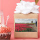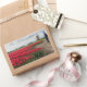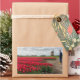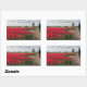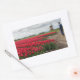 Rectangular photo sticker with a farmer wearing yellow wooden shoes inspecting his red tulips with in the background a traditional windmill in spring in the flower Bulb Region in the Netherlands.