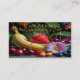 Bring customers to your farmers market with this lively farmers market card which features a photograph of A vibrant display of fresh fruits and flowers. Prominent objects include a ripe banana, a strawberry, cherries in various colours, blueberries, and a few small orange fruits. The fruits are arranged in a rustic setting, with a backdrop of lush green leaves and vivid flowers. The word 'Farmers Market' is emblazoned in golden letters at the top, suggesting the theme of fresh produce. The composition is rich in colour, with the fruits and flowers providing a burst of natural hues against a dark background.