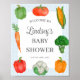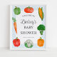 A cute farmers market boy shower welcome sign poster. Design features hand painted watercolor vegetables on a pastel blue gingham background.