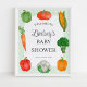 A cute farmers market green baby shower welcome sign poster. Design features hand painted watercolor vegetables on a pastel green gingham background.