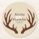 These paper coasters are country chic! Farmhouse rustic brown deer antlers and taupe paper coaster. It features the bride and groom's name in brown with the wedding date.