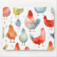Cute and happy farmhouse chickens, cosy, colourful and rustic style drawing.