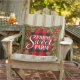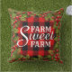 Unique, elegant and decorative December Holiday wreath pillow with cute Farm Sweet Farm quote text, on a classy red and black coloured Buffalo Lumberjack tartan checks pattern design.