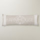 The front side of this body pillow has the word "farmhouse" in thin white letters bracketed by white scrolls and white striped sides over a light taupe background. The backside features your personalised family name.