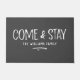 A modern rustic door mat that really makes you feel welcome. A great gift for newlyweds or new homeowners, our custom come and stay doormat in elegant durable grey and white features "Come and Stay" in modern, rustic handwritten font. Personalise with your family name in classic white lettering. Designed for you by Blackberry Boulevard.