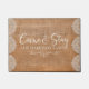 A modern calligraphy door mat that really makes you feel welcome. A great gift for newlyweds or new homeowners, our custom come and stay doormat in elegant burlap and lace features "Come and Stay" in modern, elegant handwritten calligraphy script. Personalise with your family name in classic off white lettering. Designed for you by Blackberry Boulevard.