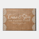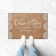 A modern calligraphy door mat that really makes you feel welcome. A great gift for newlyweds or new homeowners, our custom come and stay doormat in elegant burlap and lace features "Come and Stay" in modern, elegant handwritten calligraphy script. Personalise with your family name in classic off white lettering. Designed for you by Blackberry Boulevard.