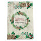 "Farmhouse Family Name Personalised Merry Christmas Pine Cone with Holly Wreath and Rustic Barn Wood Decoupage Tissue Paper." Customised with your family name in script calligraphy handwriting. Watercolor painted artwork in a rustic, country chic style for the winter and Christmas holidays. Typography style message, "We wish you a Merry Christmas." A rustic off white reclaimed barn wood background sets off the Pine cone and holly wreath with green leaf foliage greenery and accents of subtle gold glitter. Art by internationally licensed artist and designer, Audrey Jeanne Roberts, copyright.